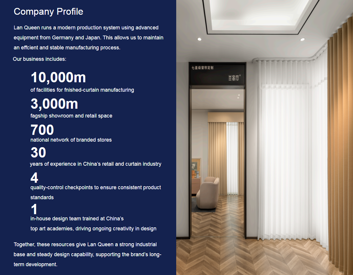 German and Japanese equipment, com-bined with a digital ERP system and a four-stage quality-control framework, ensure consistent manufacturing performance. Our portfolio covers blackout fabrics, sheers, and fabric Roman blinds, support-ed by an in-house design team focused on material and product development. |